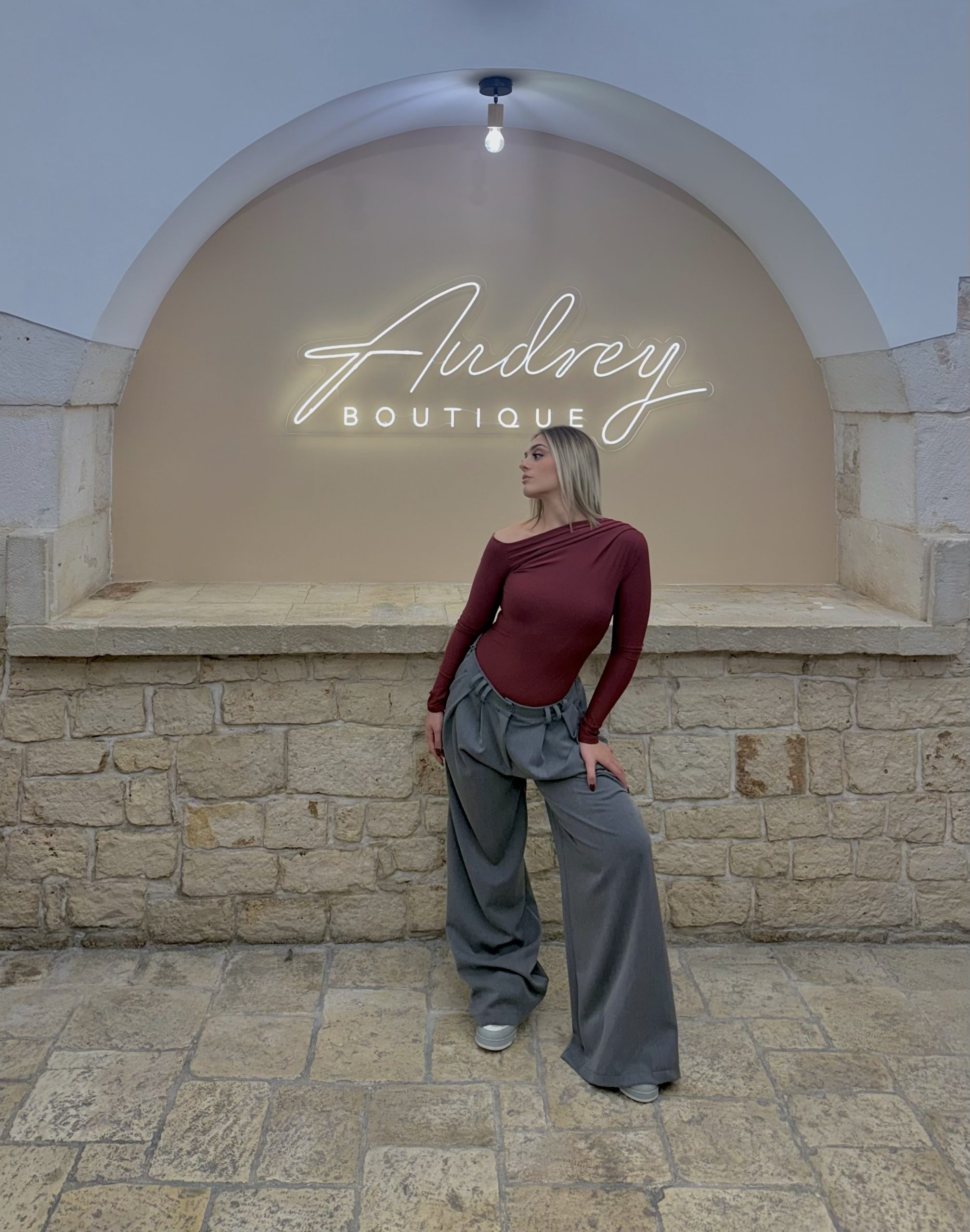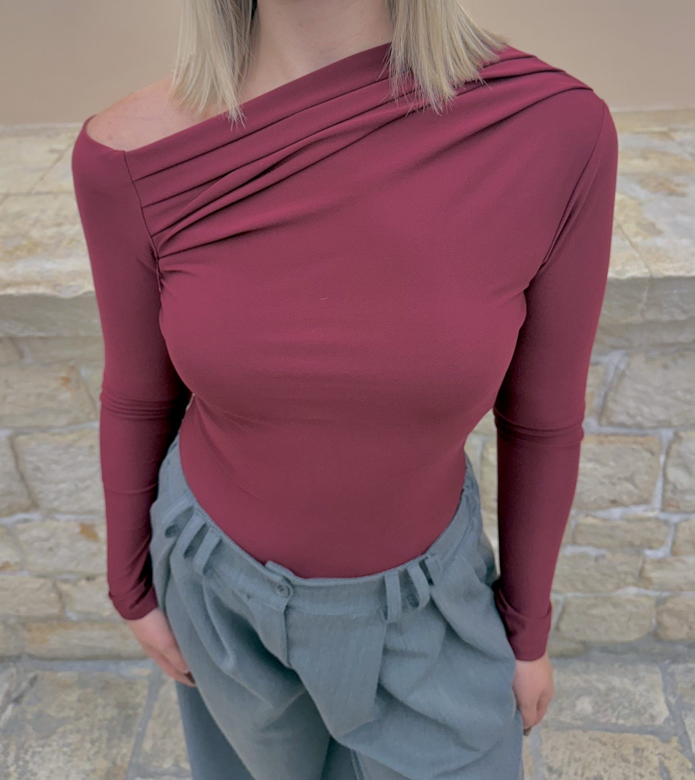 Questo body ha un design elegante e raffinato, caratterizzato da una spalla scoperta che crea un effetto asimmetrico molto femminile di tendenza. Il tessuto è morbido ed elasticizzato, aderisce perfettamente alla silhouette mettendo in risalto le forme con classe. Le maniche lunghe bilanciano la scollatura obliqua, rendendo il capo ideale per look sia casual chic che più sofisticati, a seconda degli abbinamenti.