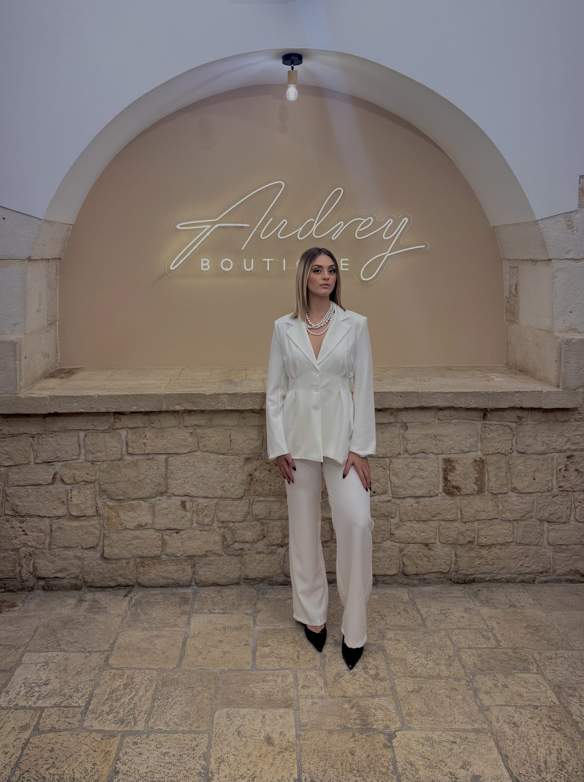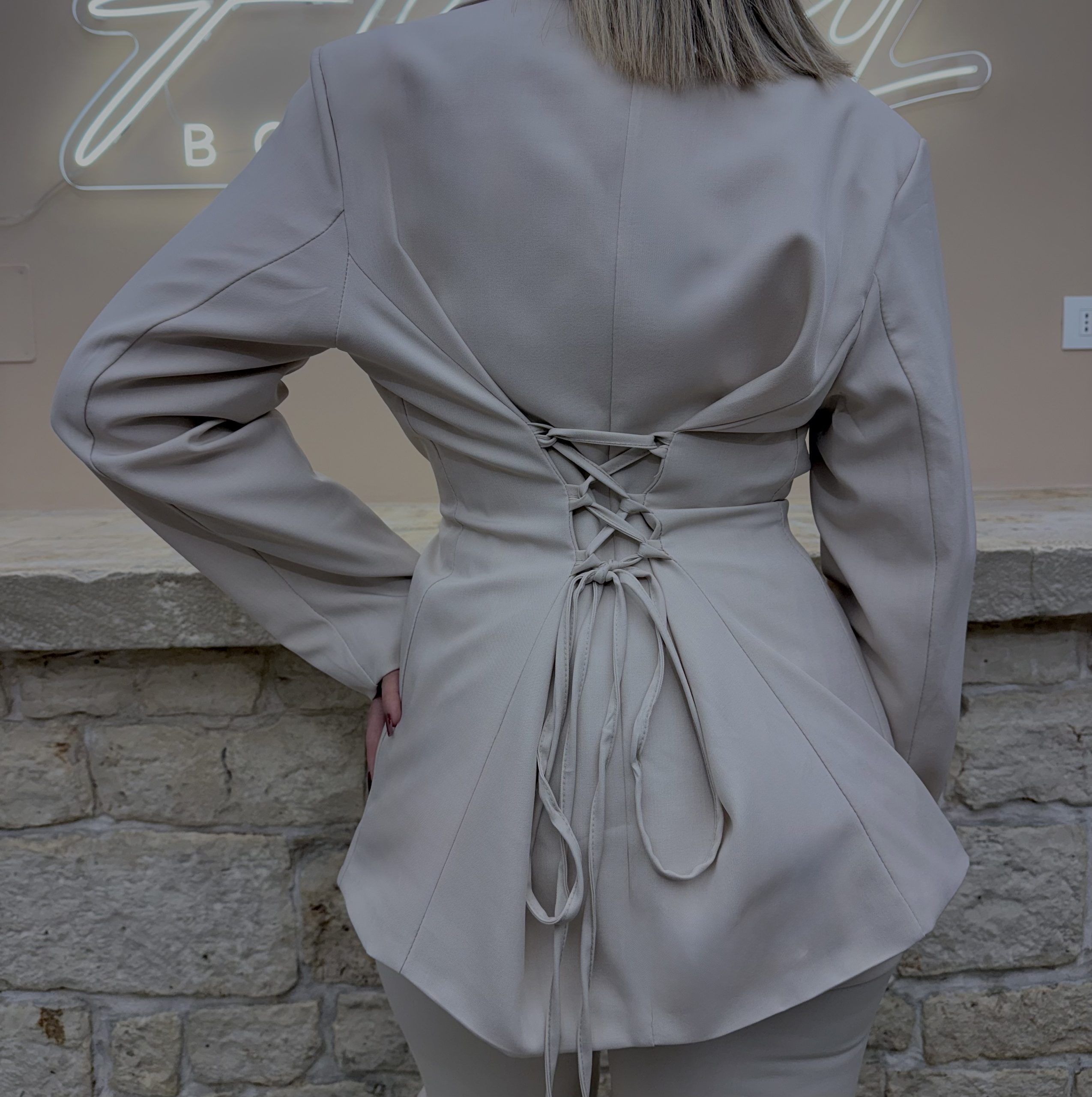 Un completo sofisticato e senza tempo. Questo tailleur si distingue per la giacca lunga dal taglio fluido con chiusura a tre bottoni e cinturino regolabile sul retro, che valorizza la silhouette con eleganza. Il pantalone coordinato completa un look raffinato e versatile, ideale per ogni evento.
