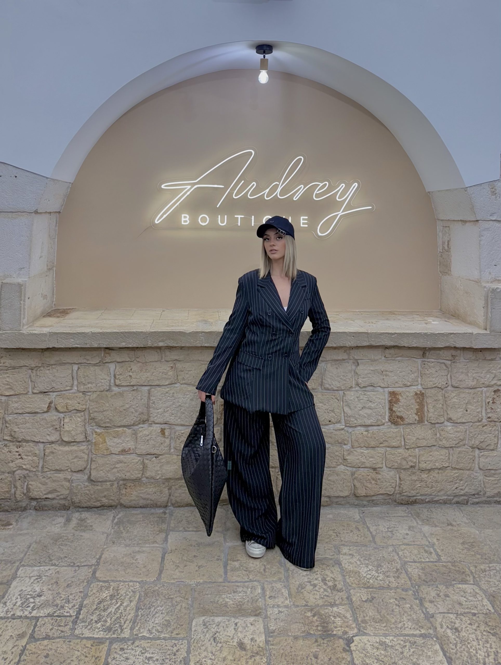 Elegante e dal fascino intramontabile, questo tailleur gessato blu navy è la scelta ideale per un look professionale e sofisticato