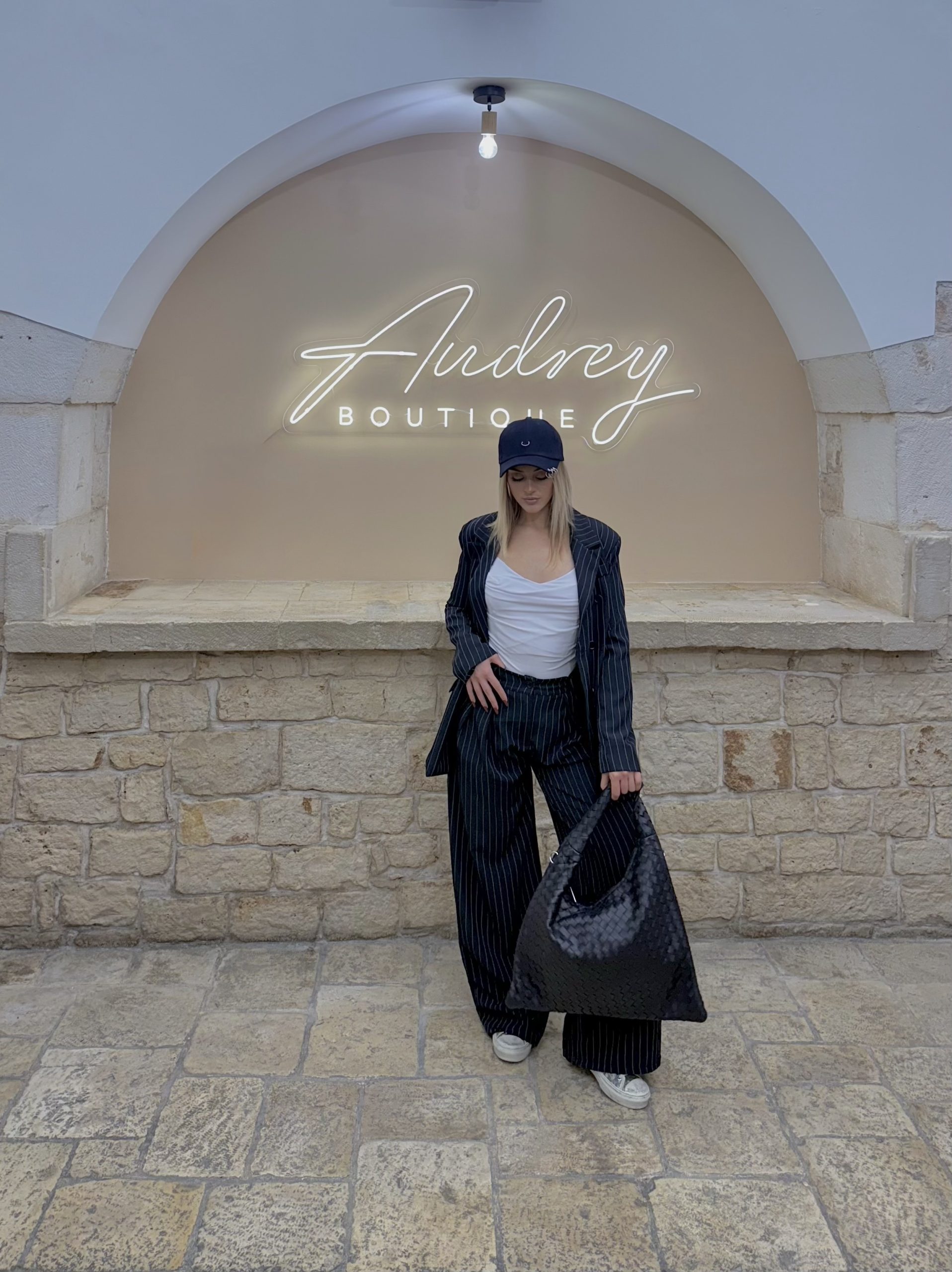 Elegante e dal fascino intramontabile, questo tailleur gessato blu navy è la scelta ideale per un look professionale e sofisticato. La giacca doppiopetto con revers classico e tasche definisce la silhouette con struttura e stile, mentre il pantalone coordinato completa l’outfit con un tocco moderno e raffinato.