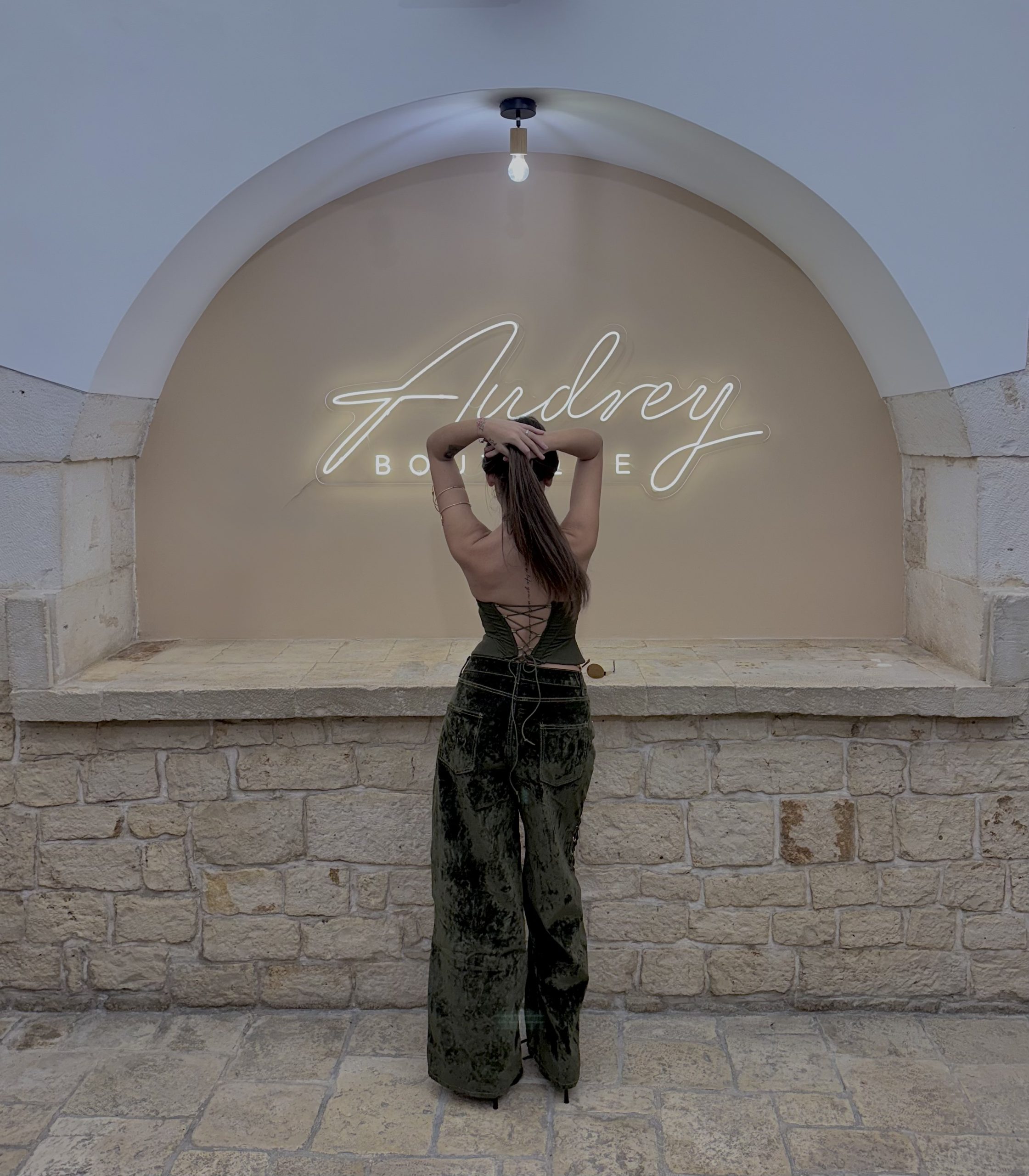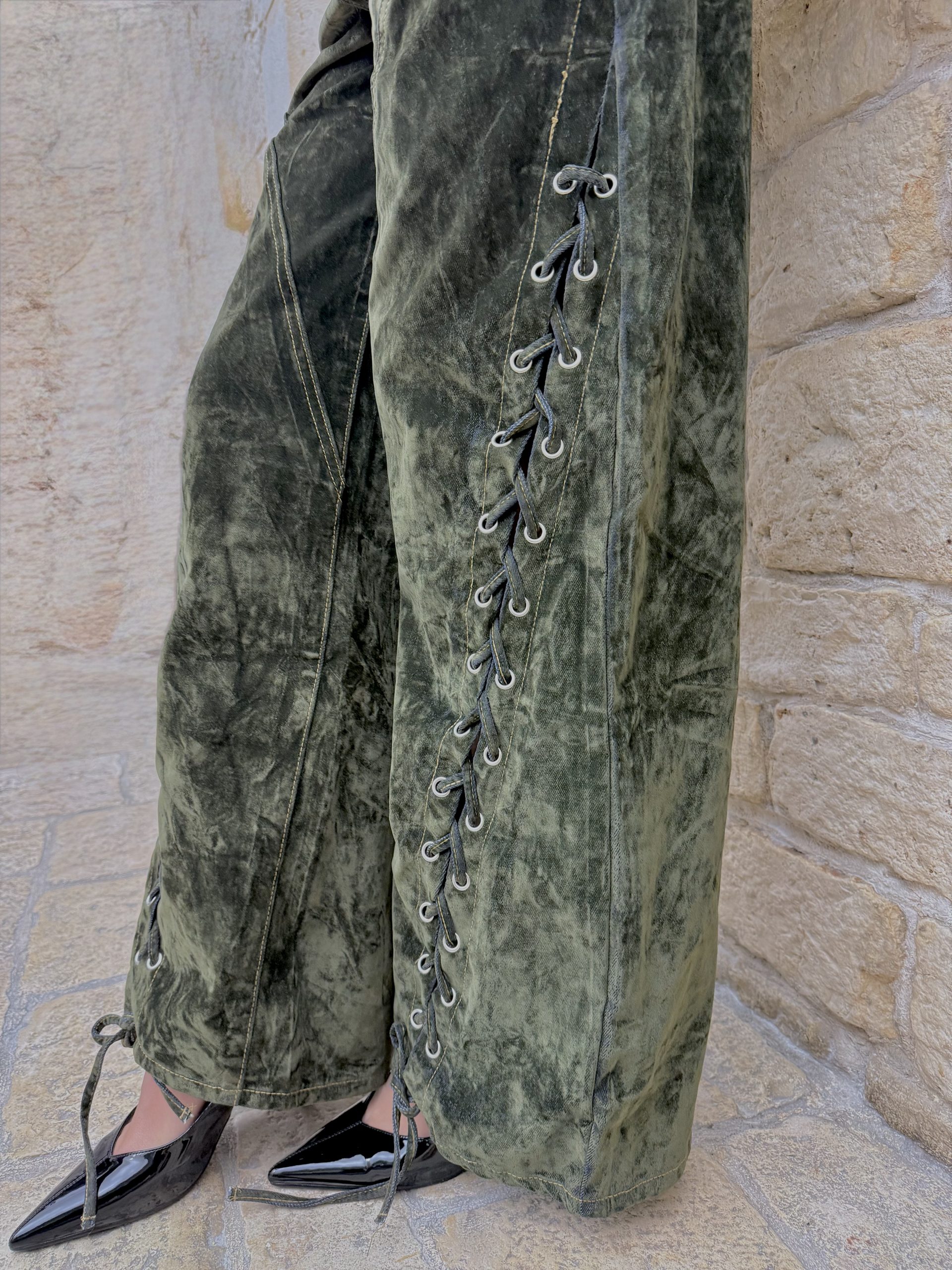 jeans in velluto verde da vibe super glam. Il tessuto morbido e luminoso si unisce ai dettagli con lacci laterali per un look audace e sofisticato. Perfetti per serate speciali o per dare un tocco chic anche ai look più casual.