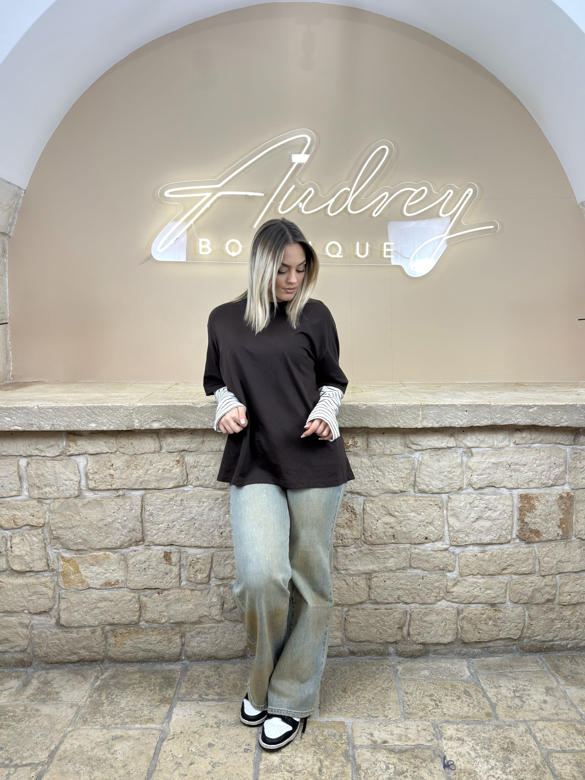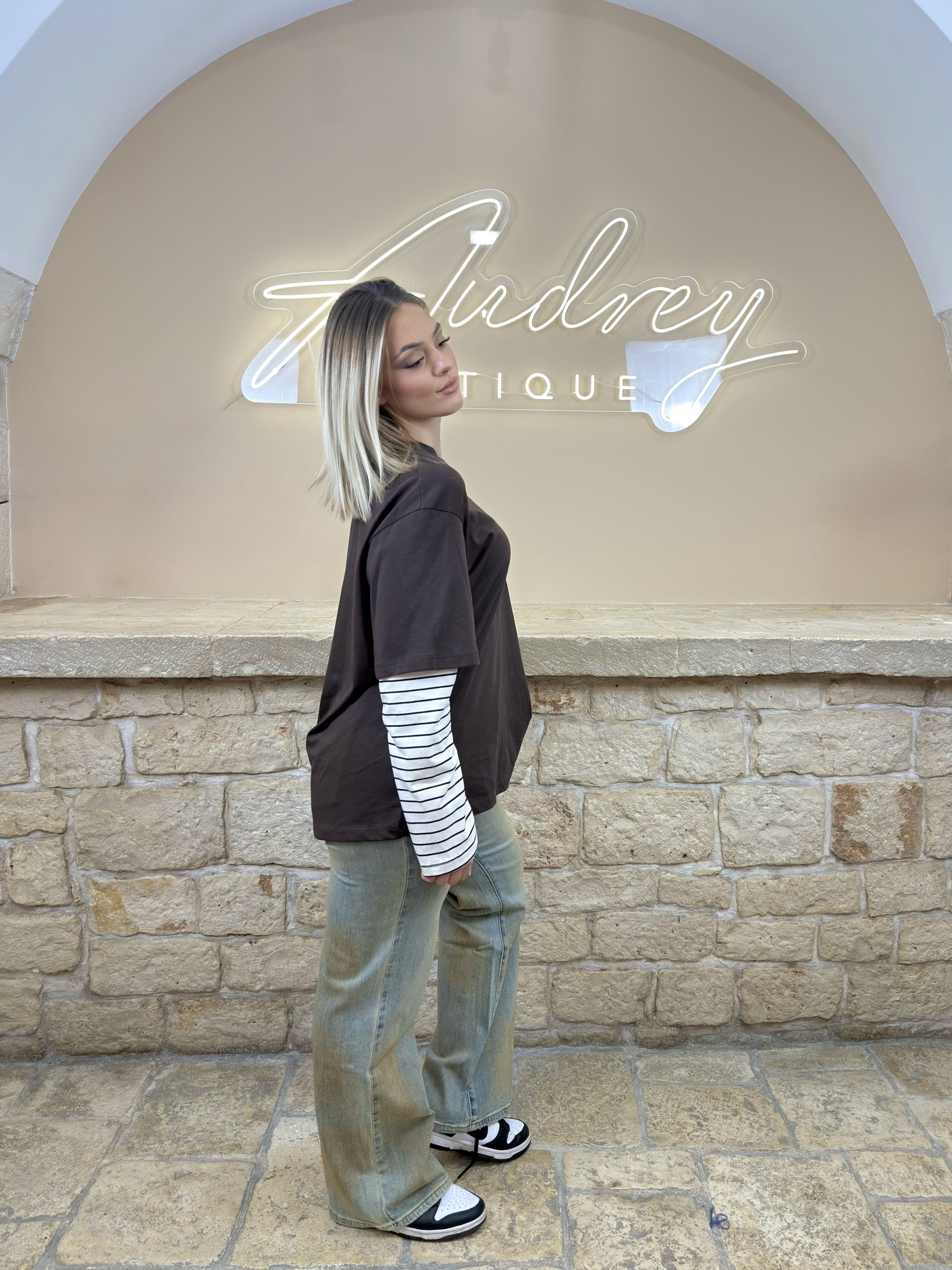 La maglia Lea combina semplicità e stile in un unico capo dal carattere deciso. Realizzata in morbido cotone, presenta un elegante effetto doppio strato: la parte superiore in tinta unita marrone si abbina a maniche e bordo inferiore a righe sottili beige e nere.