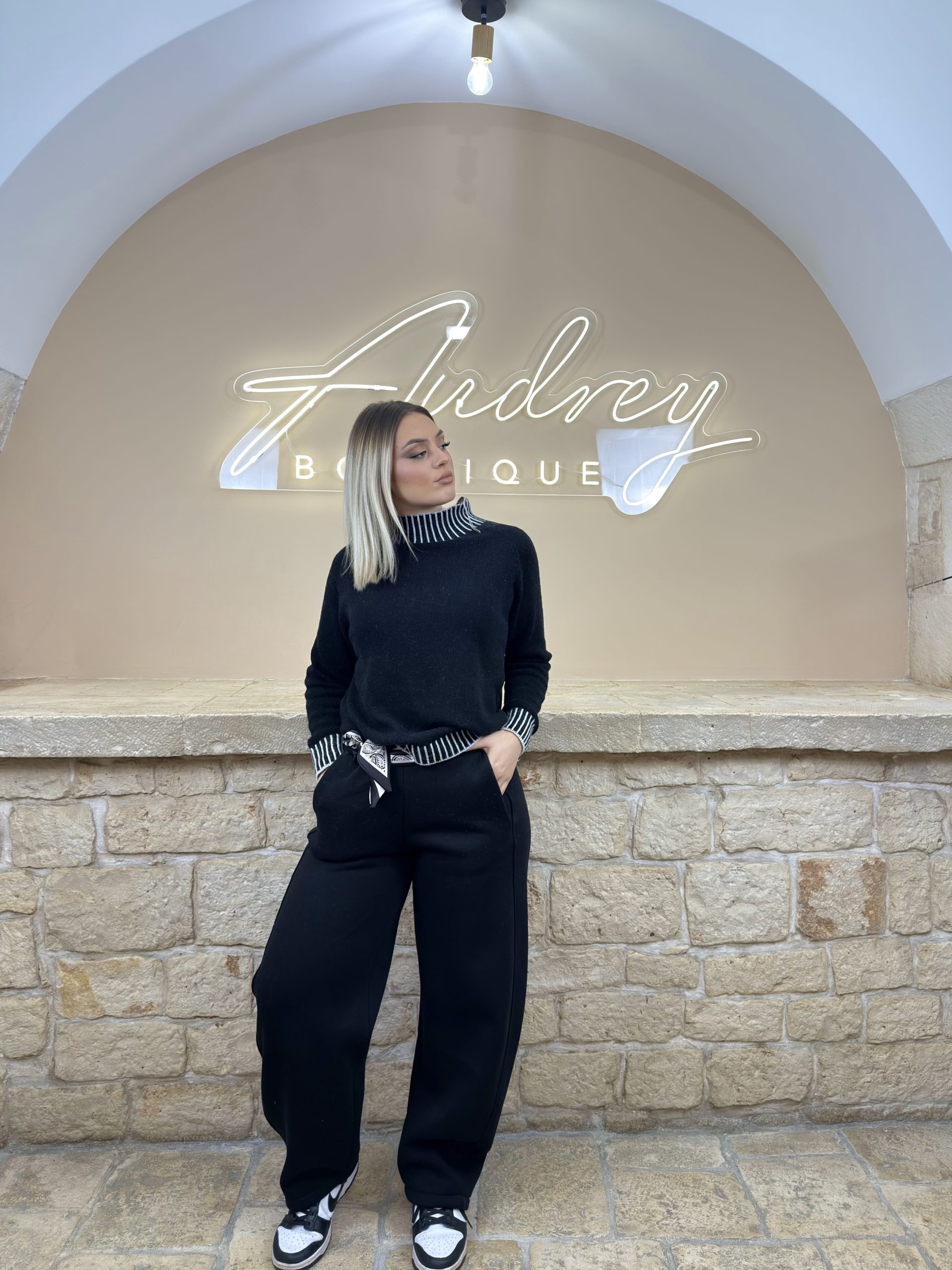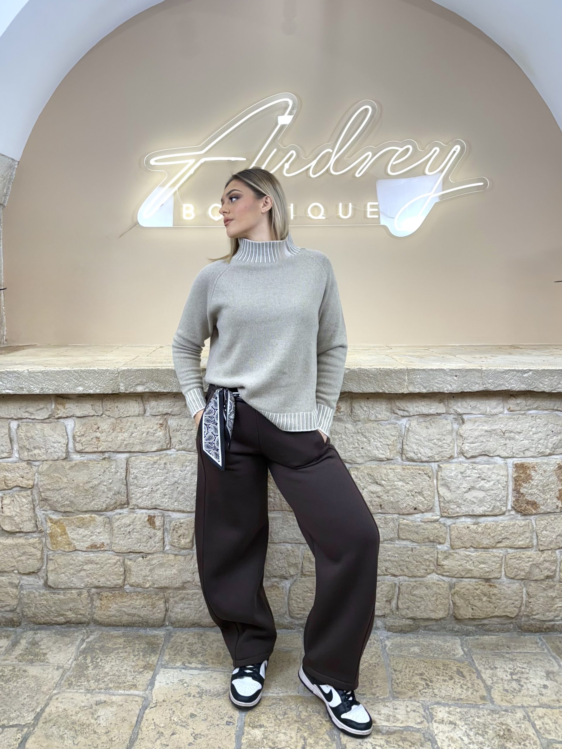 Comodi e versatili, questi pantaloni da donna sono perfetti per un look casual ma curato. Realizzati in tessuto morbido e caldo, presentano una vita elasticizzata che assicura massimo comfort e una cintura in tessuto foulard a fantasia che aggiunge un tocco chic e originale.