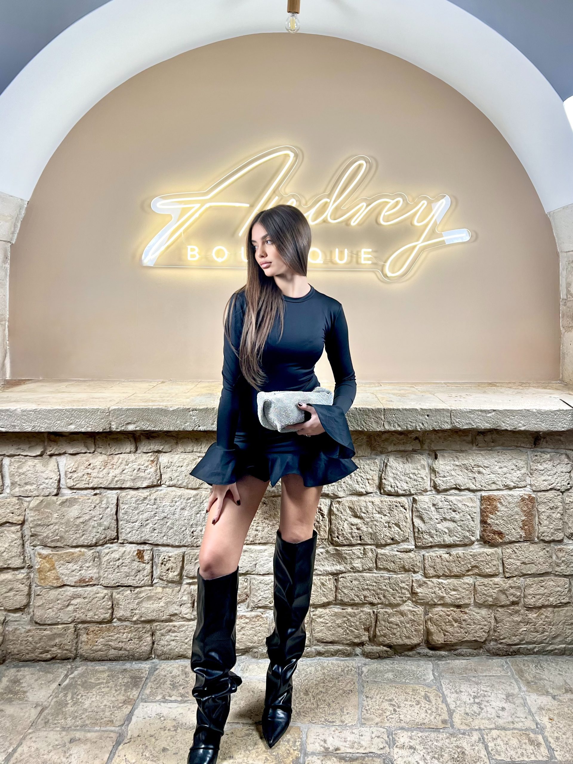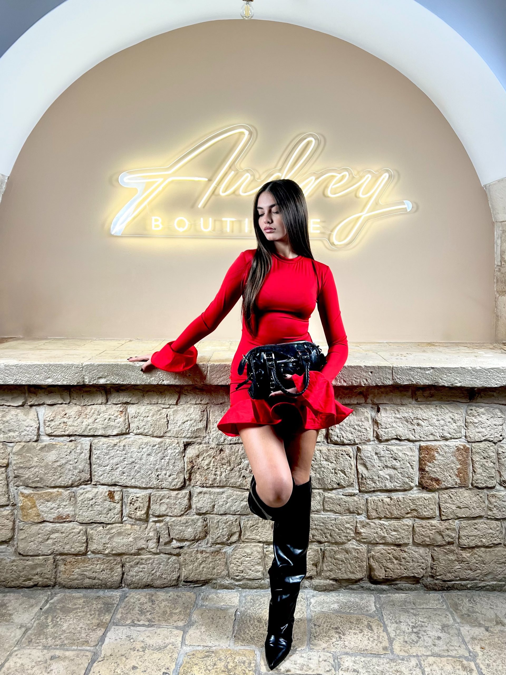 Un abito dal design raffinato e sensuale, realizzato in lycra viscosa che avvolge la silhouette valorizzandola con una vestibilità impeccabile. Le maniche decorate da volant morbidi e la balza scenografica sul fondo donano movimento e femminilità.