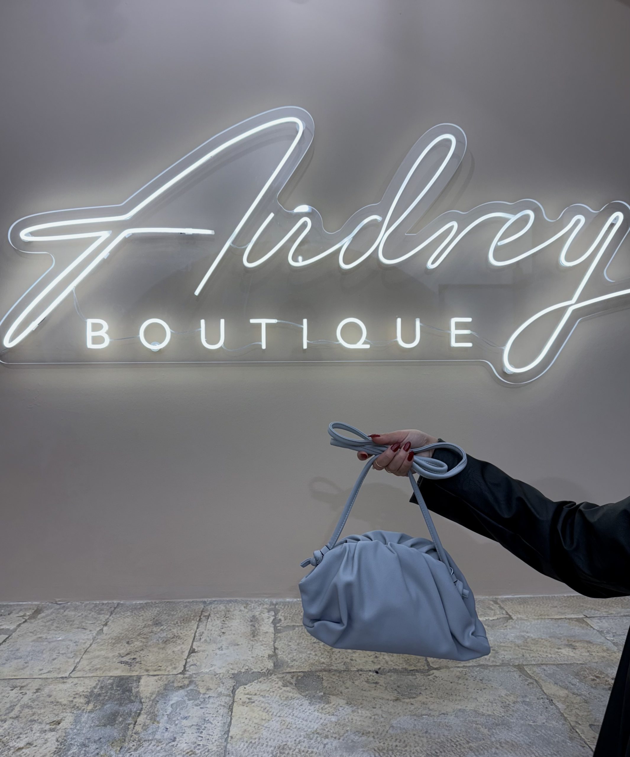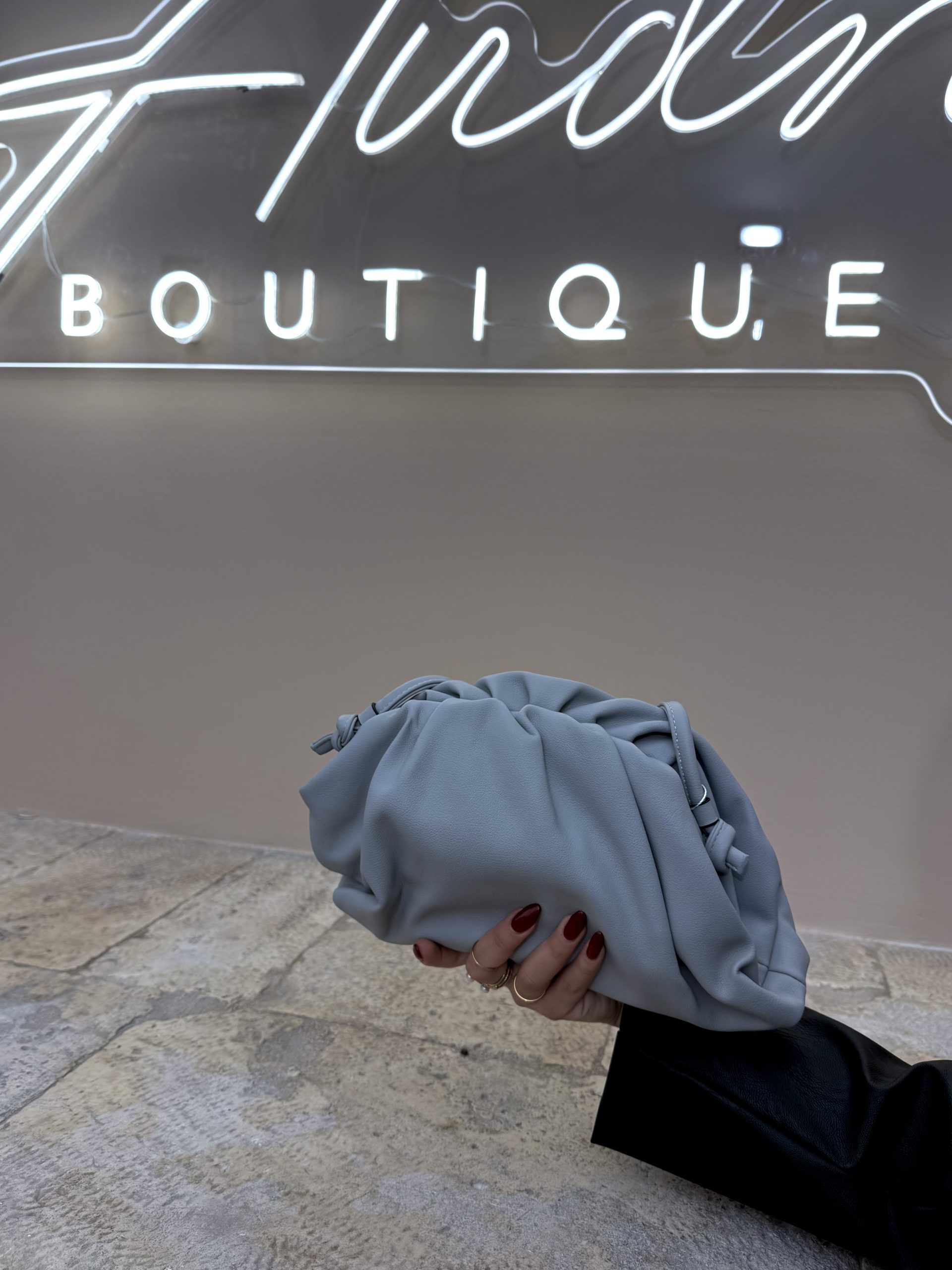 Questa è una borsa a mano modello pouch dal design morbido e moderno. Realizzata in ecopelle liscia color grigio chiaro, con una texture soffice e un effetto nuvola molto elegante. La chiusura è a clip magnetica con piega arricciata, creando quel tipico effetto sacchetto di tendenza, è accessoriata di una tracolla.