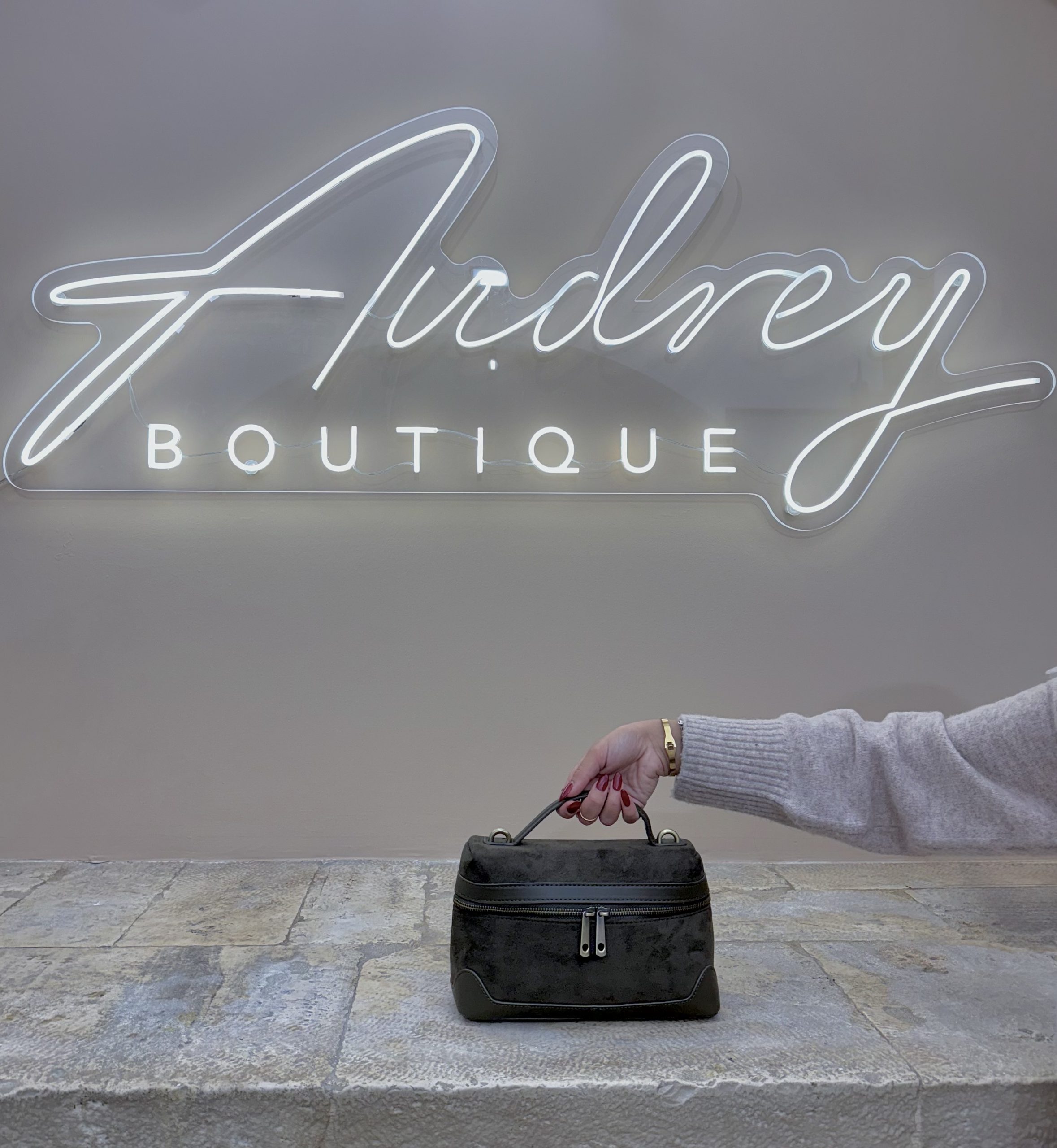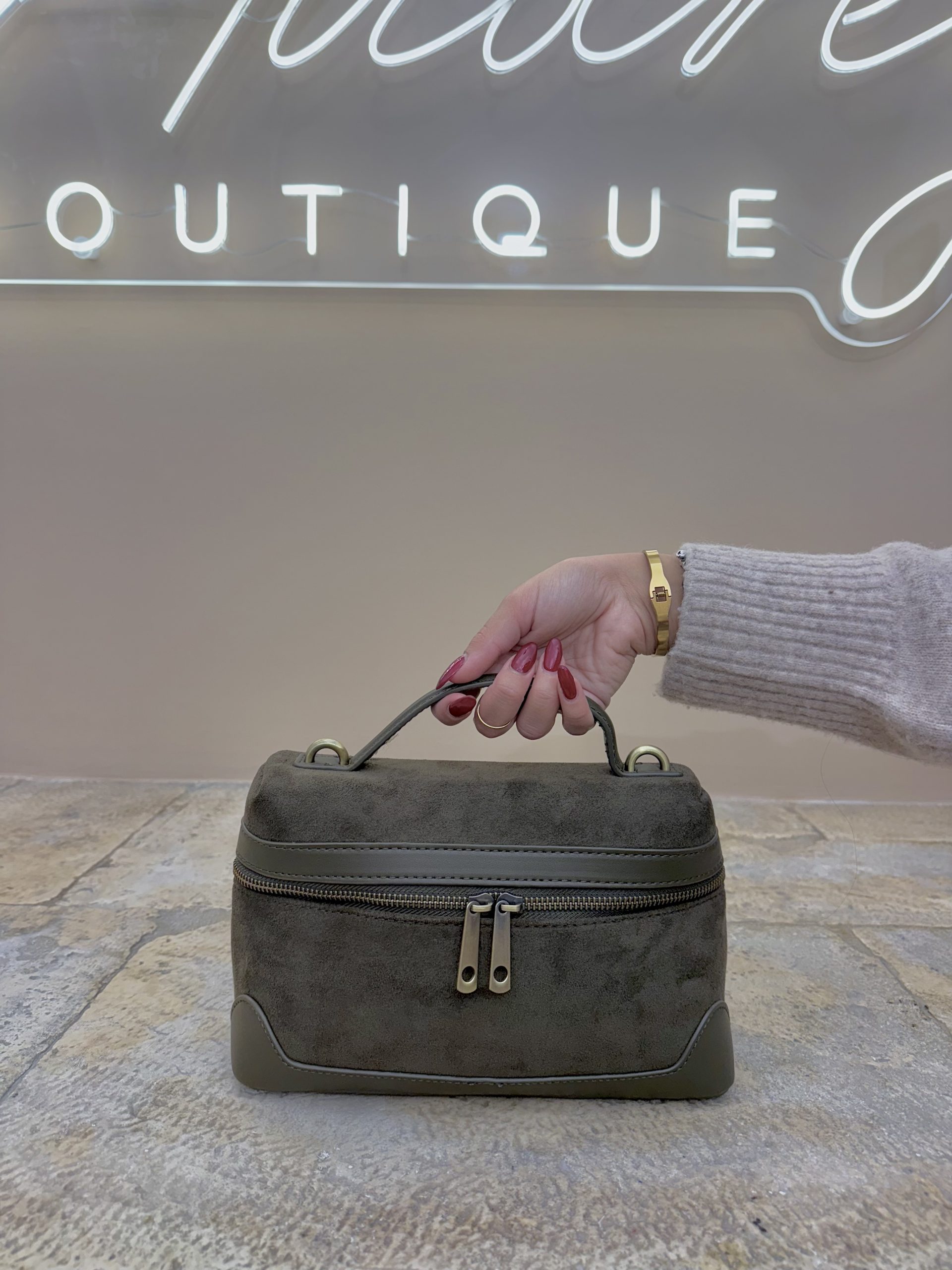 La Vanity chic è una borsa a mano compatta, perfetta per un look raffinato ma pratico. È realizzata in materiale effetto scamosciato verde militare, con dettagli in pelle liscia tono su tono lungo i bordi e la base, che ne valorizzano la forma e aggiungono un tocco di classe. La chiusura principale è costituita da una cerniera doppia con tira lampo metallici dorati, che dona un dettaglio chic e funzionale.