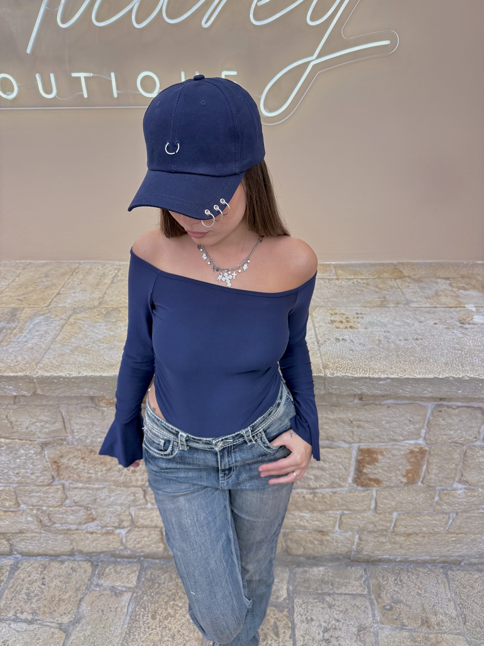 Cappellino baseball in cotone blu navy, dal design moderno e grintoso. Il modello presenta una visiera curva con una struttura classica, impreziosita da anelli metallici decorativi applicati sulla visiera e sul lato per un tocco urban e Street di grande tendenza. Perfetto per completare il look casual sportivi con carattere, aggiungendo un dettaglio audace e contemporaneo.